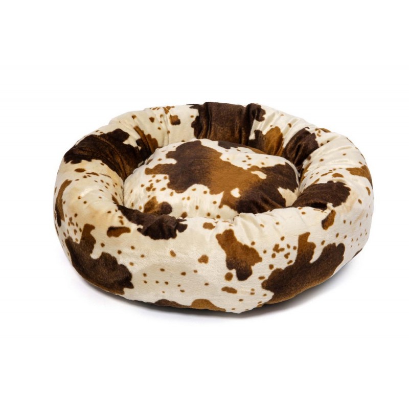 Cuccia a forma di ciambella in soffice pelliccetta maculata beige e marrone, con cuscino estraibile, imbottita con morbida fibra di poliestere, con base antiscivolo.