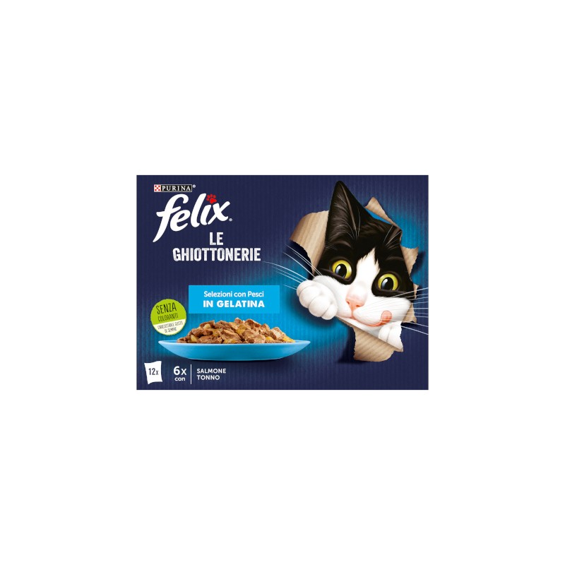 Le Ghiottonerie in gelatina, succoso mix a base di morbidi bocconcini di pesce fresco in gelatina in 2 varianti miste, rappresentano un pasto completo, che soddisfa perfettamente le esigenze dei gatti adulti. Teneri bocconcini di tonno e samone in gelatina saporita, privi di conservanti e coloranti artificiali.