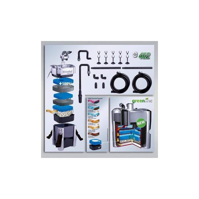 Pompa silenziosissima a 450l/h. Nuovo sistema prefiltrante brevettato: 100% in più di superficie rispetto al modello 401. Alta prestazione di filtraggio biologico, 4,6 l di volume, raccordi tubi orientabili a 360°, masse filtranti di agevole ricambio