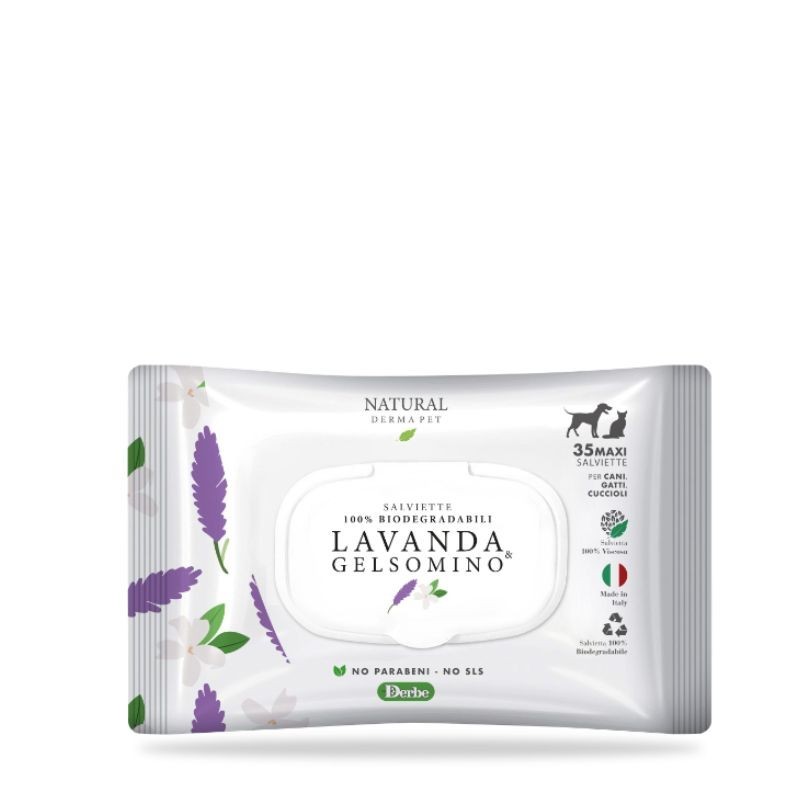 Salviette Detergenti Profumate Lavanda e Gelsomino Derbe 35 Maxi per Cani Gatti Cuccioli 100% Biodegradabili