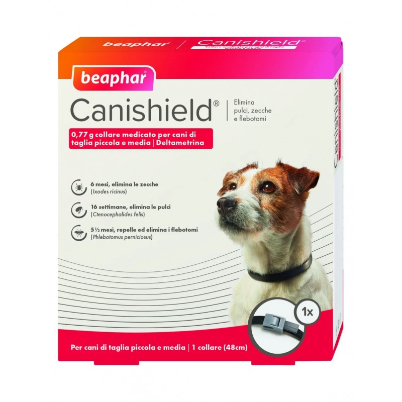 Beaphar Canishield è un collare antiparassitario per cani di piccola taglia, indicato per ridurre il rischio di leishmaniosi. Grazie al suo principio attivo repellente, la deltametrina, allontana i pappataci e impedisce loro di pungere il cane, riducendo il rischio di trasmissione della leishmaniosi.