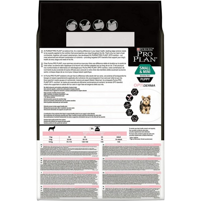 Purina Pro Plan Small & Mini Adult Sensitive Skin Salmone & Riso è privo di glutine e contribuisce con le sue sostanze vitali al benessere dei cani adulti predisposti a sensibilità cutanee e digestive. Le vitamine, i minerali, gli oligoelementi, la radice di cicoria disidratata e l'olio di pesce contenuti nelle crocchette favoriscono la salute delle articolazioni, che nei cani di taglie piccole risultano maggiormente sollecitate per via delle zampe corte.