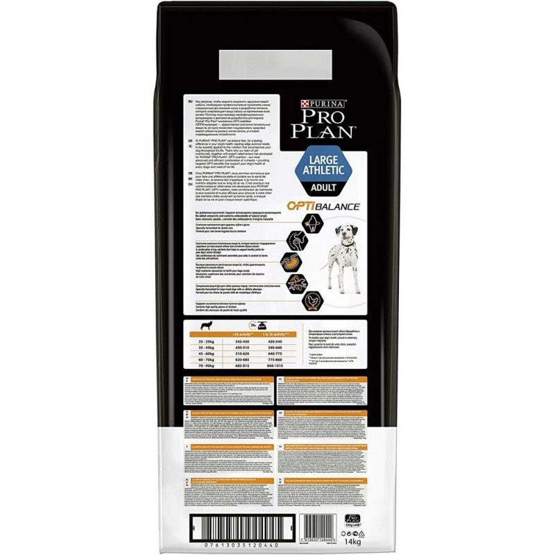 L'alimento per cani adulti Purina PRO PLAN Large Athletic con OptiBalance aiuta a supportare la salute delle articolazioni, si prende cura dell'igiene dentale e favorisce un elevato assorbimento di nutrienti per soddisfare le esigenze del tuo cane ad ogni pasto. Preparato con pezzi di pollo di alta qualità, questo alimento secco completo contiene tutto ciò di cui il tuo cane di taglia grande con corporatura atletica ha bisogno per le sue esigenze di salute quotidiane.