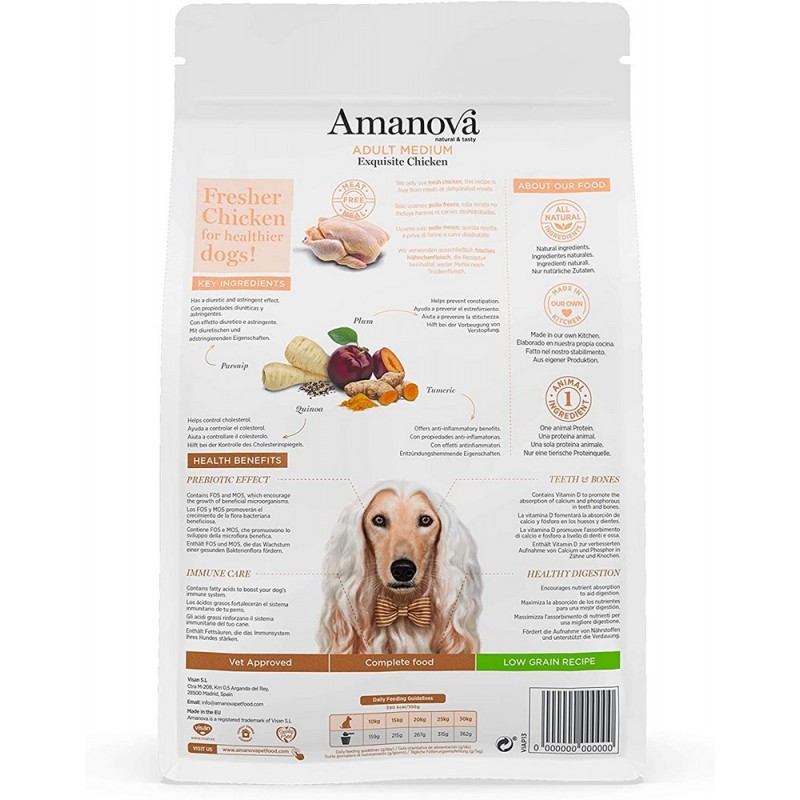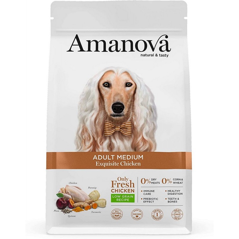Amanova Adult Exquisite Chicken è un alimento ipoallergenico per cani di taglia media o grande, preparato solo con pollo fresco, che fornisce una miscela equilibrata di proteine biologiche per il corretto sviluppo e mantenimento della muscolatura.