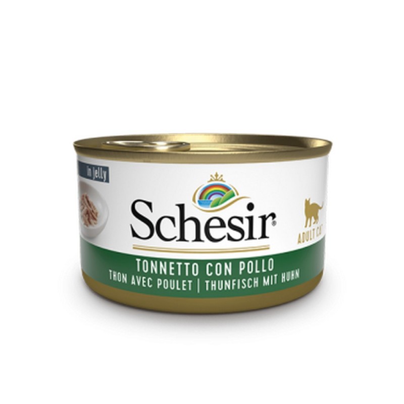 Schesir al tonnetto e pollo in gelatina costituisce un pasto completo nella pratica lattina da 85gr.