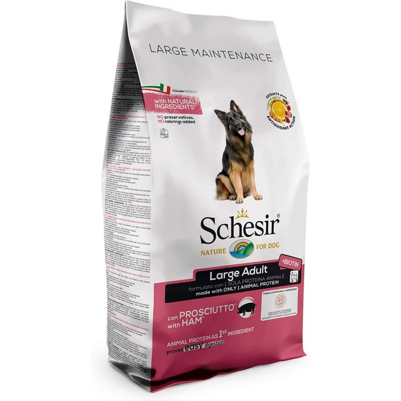 Schesir Dog Adult Large Maintenance Prosciutto è l'alimento secco ideale per cani di piccola taglia che ha come unica fonte proteica animale il suino (di cui 6% prosciutto): un gustoso alimento completo e bilanciato, facilmente digeribile, che soddisfa le esigenze nutrizionali dei cani adulti di taglia grande, di tutte le razze.