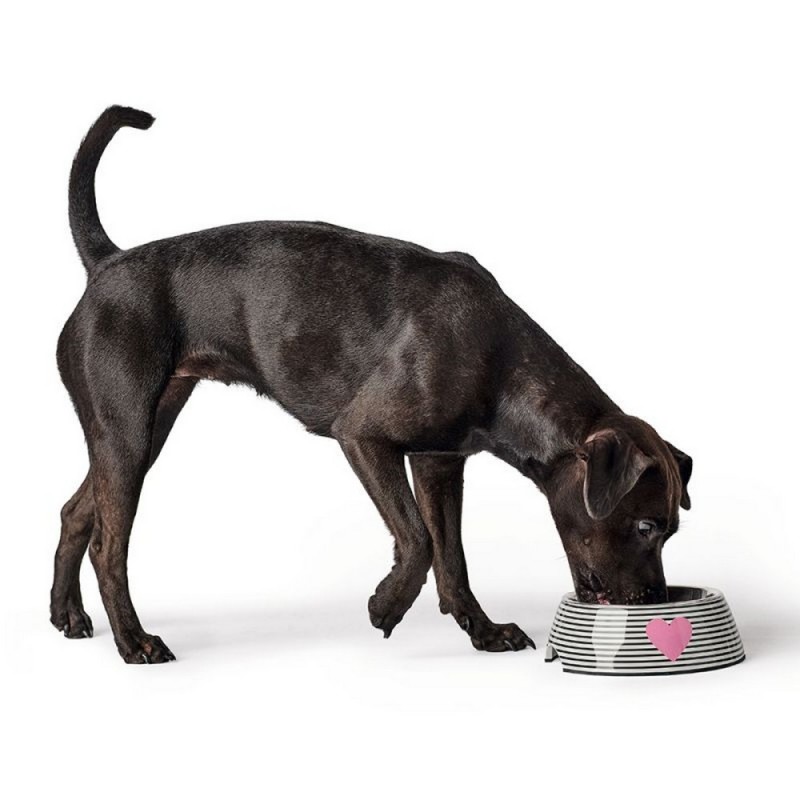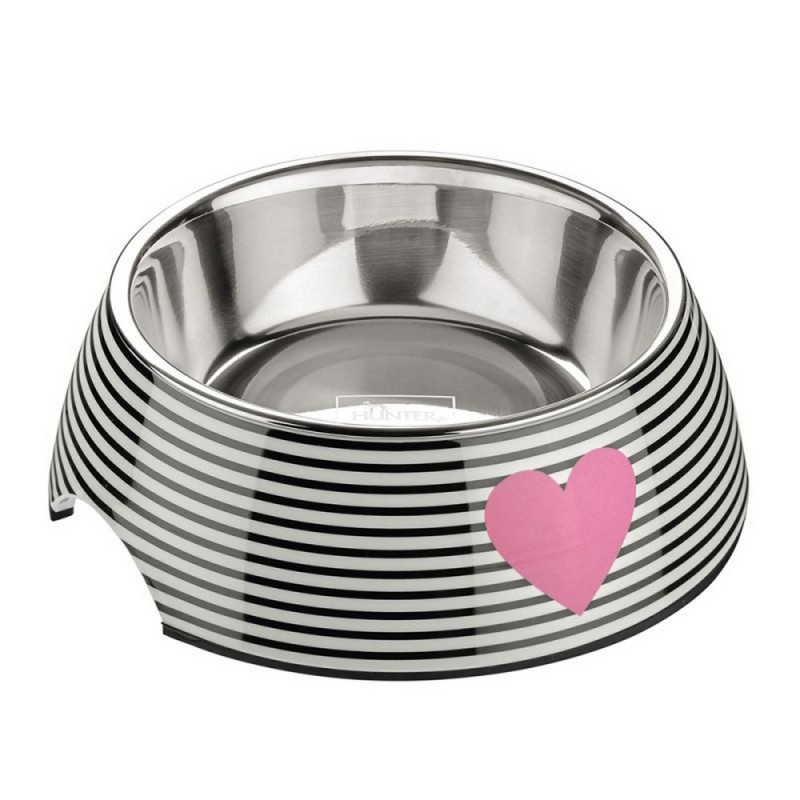 Questa ciotola per cani e gatti di Hunter è costituita da un supporto antigraffio e antiurto in melamina e da una ciotola interna estraibile in acciaio inossidabile. Il supporto è decorato con righe black and white con un cuoricino rosa, che di sicuro non passerà inosservato! Entrambe le parti sono lavabili in lavastoviglie. Grazie al fondo antiscivolo, la ciotola rimane ben ferma sul pavimento.