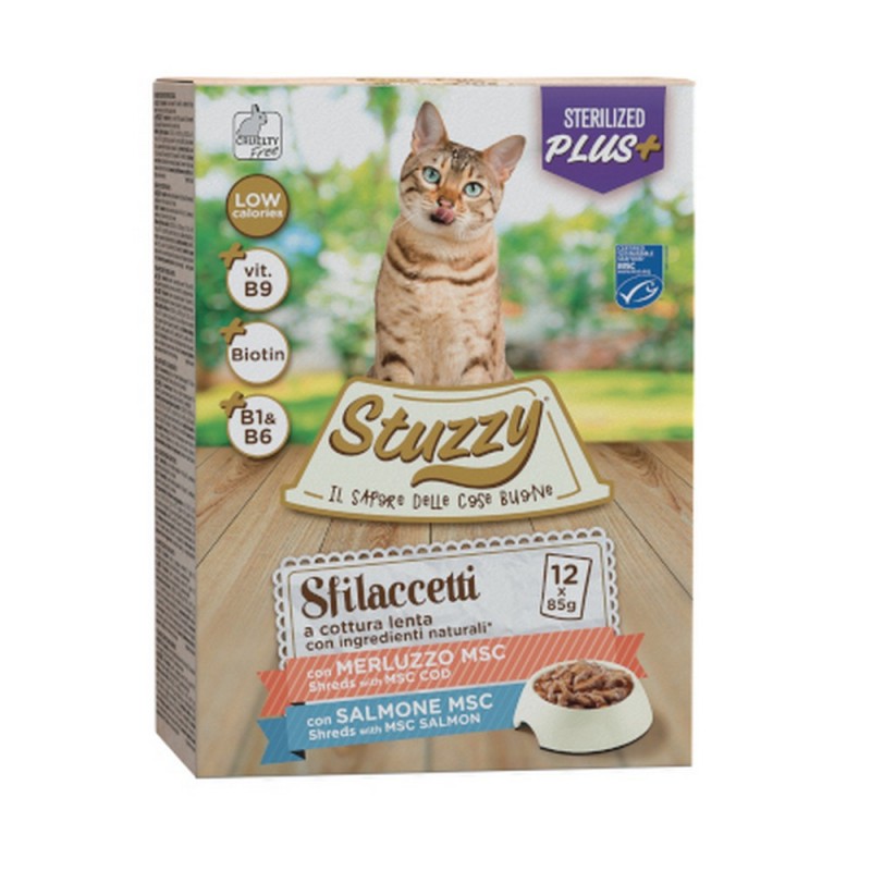 Multipack Sfilaccetti Stuzzy Cat Sterilized Plus con Merluzzo e Salmone 12 Bustine da 85 Gr